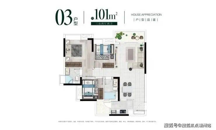 建面约101㎡户型则比98㎡户型多了一个生活阳台,可以摆放洗衣机干衣机等,也可以收纳杂物,美景生活两不误。
