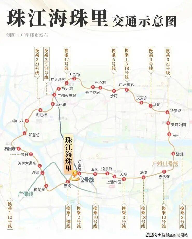 项目与2号线江泰路站的直线距离只有约400米。(测距:百度地图)这个站预计在今年还会开通11号线大环线。未来从项目出发,可以直达天河、海珠、荔湾、越秀、白云中心五区,无缝切换广州目前近80%的地铁线。如果未来去江泰路站的江南大道路段开通,海珠里的地段优势将会更加明显。此外,距离项目约950米还有广佛线燕岗站,就算广佛通勤也不会觉得吃力。