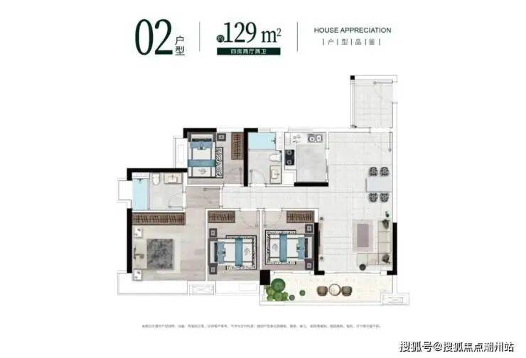 建面约129㎡户型,四房带套间,并同时集合了以上户型的入户花园、大阳台(约6.6米)等亮点,直接一步到位。