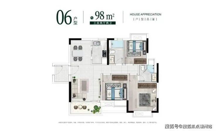 建面约98㎡户型则更适合于三代同堂的家庭,主卧带有独立卫生间,更能保障男女主人的隐私,享受二人世界。