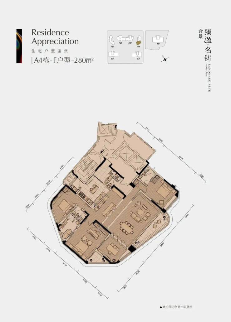 约 280 平四房格局非常规格,每个空间独立设计,对开发商的产品打磨能力有一定考验。