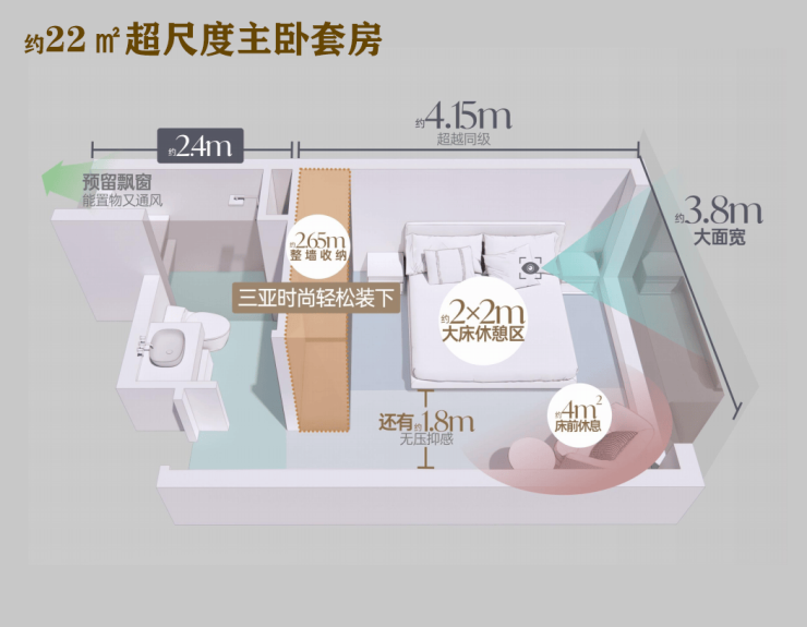 约22㎡主卧大套房,约3.8m南向面宽,全景飘窗,营造出开阔的空间感,晨曦午后,悦心私享天地。