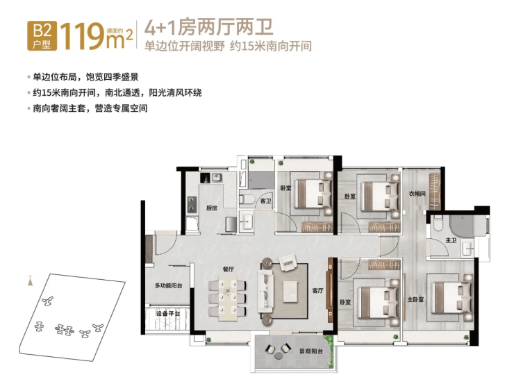 【119㎡4+1房2厅2卫】单边位布局,15米南向开间,南北通透南向奢阔主套,配独立衣帽间