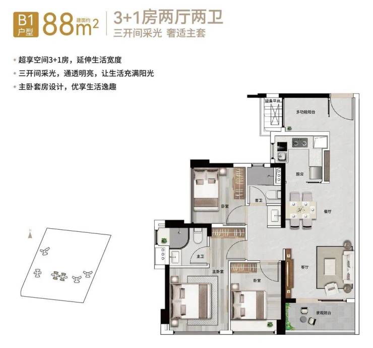 【88㎡3+1房2厅2卫】经典竖厅格局,三开间采光,近11㎡主卧套房