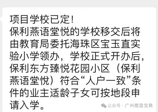 保利燕语堂悦配建了一所24班的小学,并且该学校已正式官宣引进海珠宝玉直教育集团办学以及管理,该学校开办之后,只有业主们符合人户一致就可以优先入读。