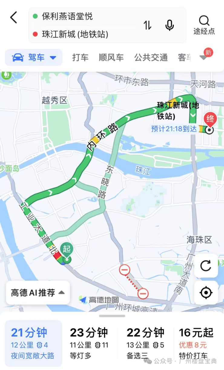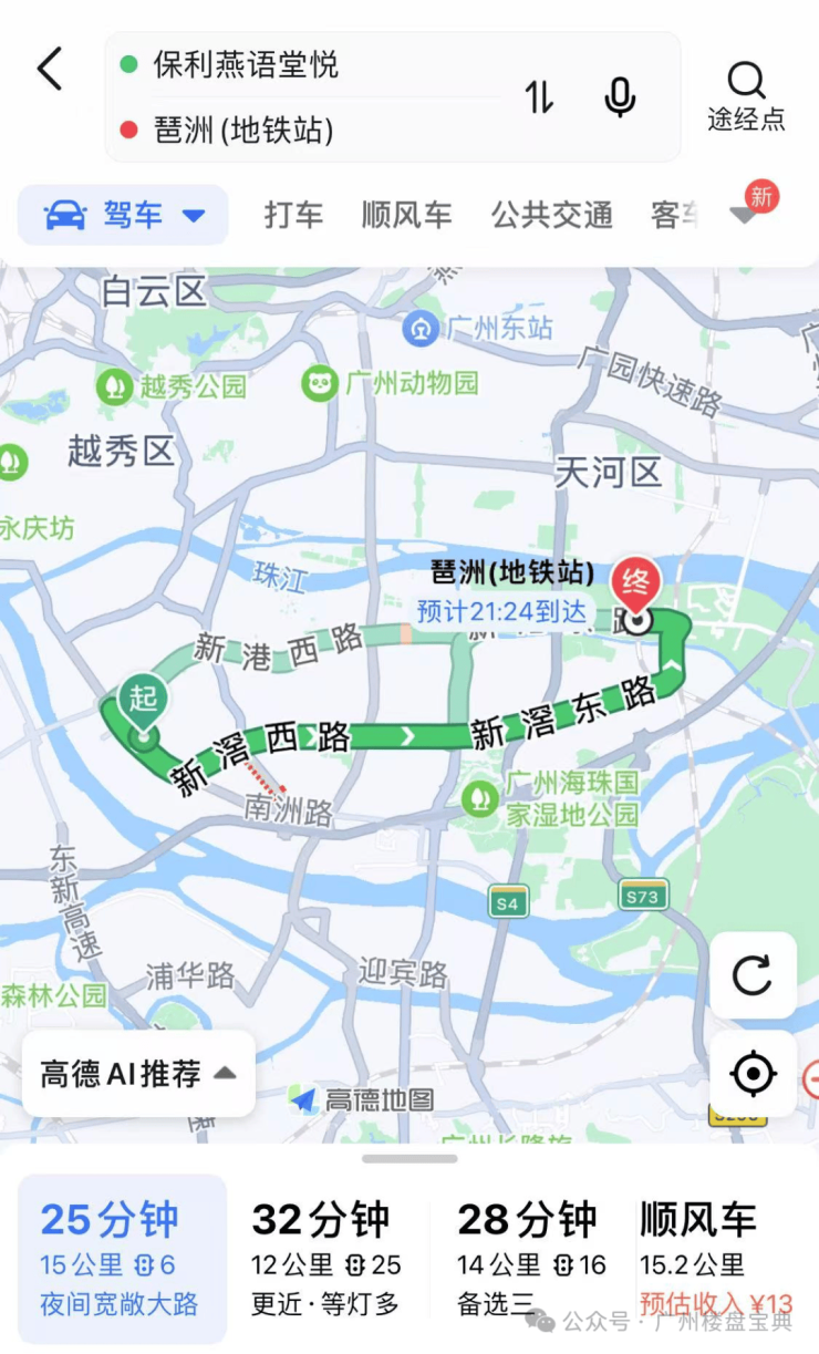 自驾或地铁通勤琶洲:走新滘西路转新滘东路即可到达琶洲,全程15公里耗时25分钟,打车22块,地铁8站耗时32分钟。