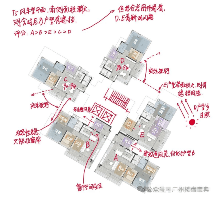 保利燕语堂悦目前B1、B3栋还有少量尾货,还有新加推的B2栋,户型约90-110-120平平,90平户型居多,占比6成,燕语堂悦采用的改良风车型楼型,实现户户朝南,与常见塔楼相比,优势更大:其一,各梯腿尽可能远离核心筒,梯腿间平行分布,或展开90-180°夹角,主视线相互错位,降低了互视遮挡的影响;其二,全部单边位,尽可能延长单体面宽,为更好的通风采光创造了条件。