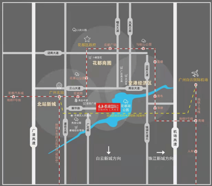 项目地理位置优越,交通十分便捷。毗邻白云机场、广州北站双国际枢纽,方便出行国内外。距离地铁 9 号线花果山公园/花城路站仅 8min 路程,通过地铁可快速到达市区各地。10min 车程直达广州首个市内免税综合体,满足购物需求;10min 直通广州北站,近享 37 线铁路通勤,出行选择多样。12min 通机场高速,15min 畅达空港经济圈,15min 广清高速新华出口,30min 直达珠江新城,无论是商务出行还是日常通勤都极为便利。