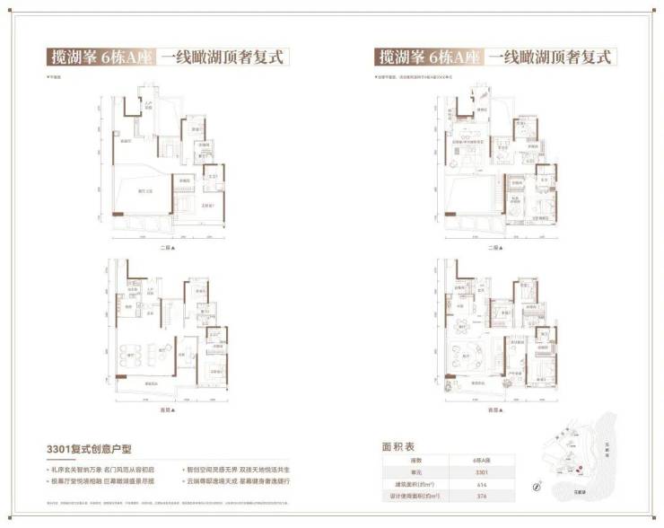 御湖峯 2 栋 A 座 3101 复式户型 438㎡ 空中墅境·复式迭代之作:438㎡的超大空间,打造出空中墅境的奢华感受。作为复式迭代之作,它在空间利用和设计上更加出色,首层和二层的创意设计,提供了丰富多样的功能区域,满足大家庭的居住需求,彰显尊贵身份。