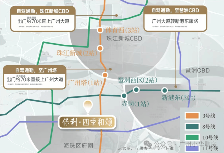 3/8/10/11号线4地铁交汇,1站广州塔,2站珠江新城,3站琶洲西区;出门即广州大道,畅达珠江新城,体育西,琶洲。
