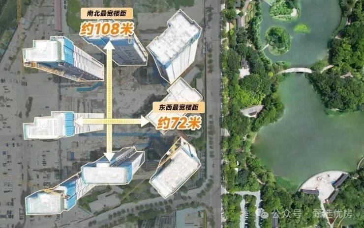 超尺度的楼间距(南北楼间距最宽约108米,东西间距最大达到约72米)