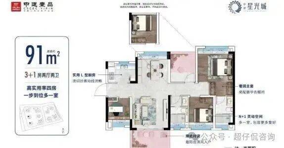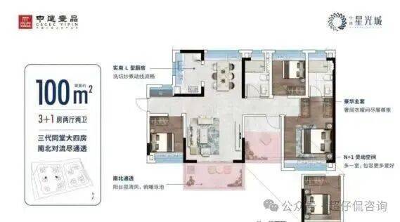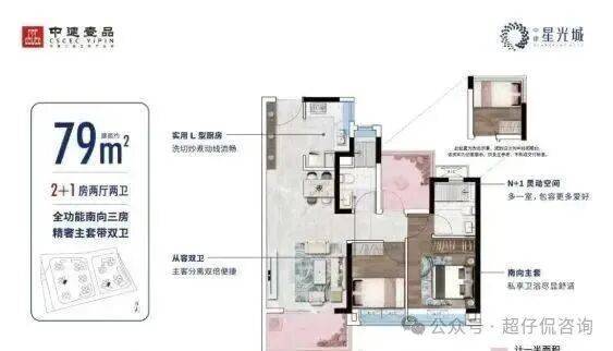 产品:项目总体南低北高,保证日照需求,蝶形设计,保证户户朝南,围合式布局,保证户户望园林。中建星光城分两期建设,目前在售69㎡-100㎡户型。
