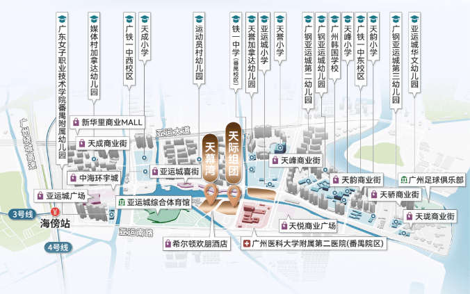 多条地铁也从片区穿过,其中,亚运城正位于3、4、8号线3条地铁线路的交汇处(3号线东延段在建、8号线规划中),从亚运城出发,2站到思科智慧城,3站到大学城,7站可到天河。其中,亚运城毗邻的海傍站还是3号线东延段的始发站,地铁限流、没位置坐等问题,在亚运城统统不用担心
