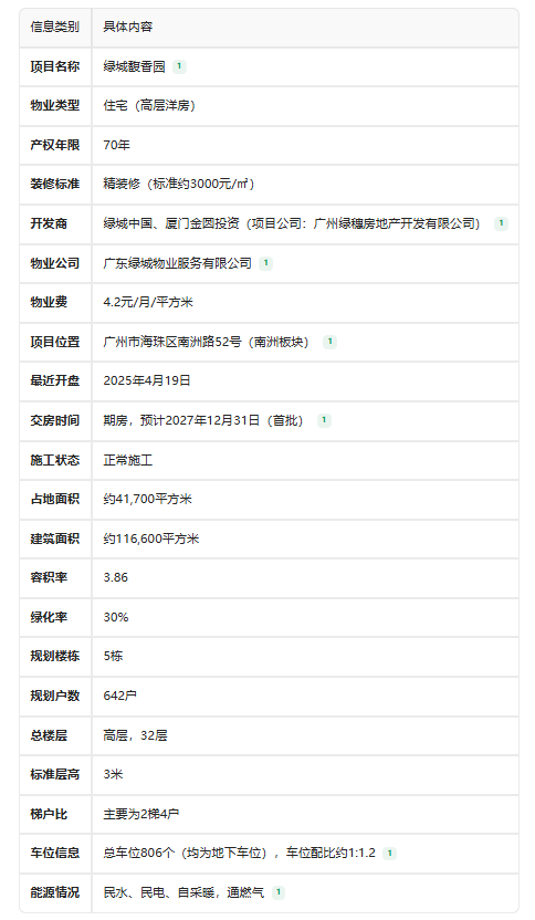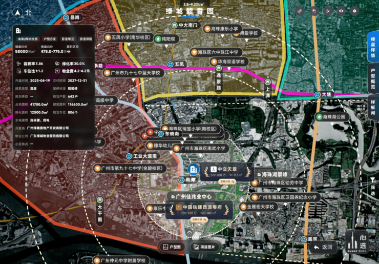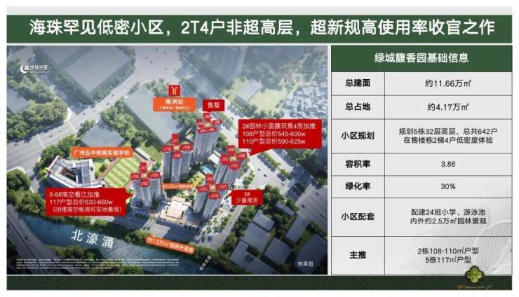 容积率约3.86,在海珠核心区偏低;围合式+蝶形楼栋,采光视野好。约1.2万㎡中央园林,以岭南十香园为灵感,打造“一轴一带五境六集七园”,全龄活动区齐全。
