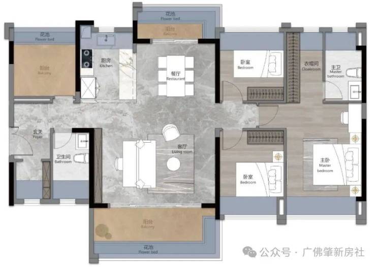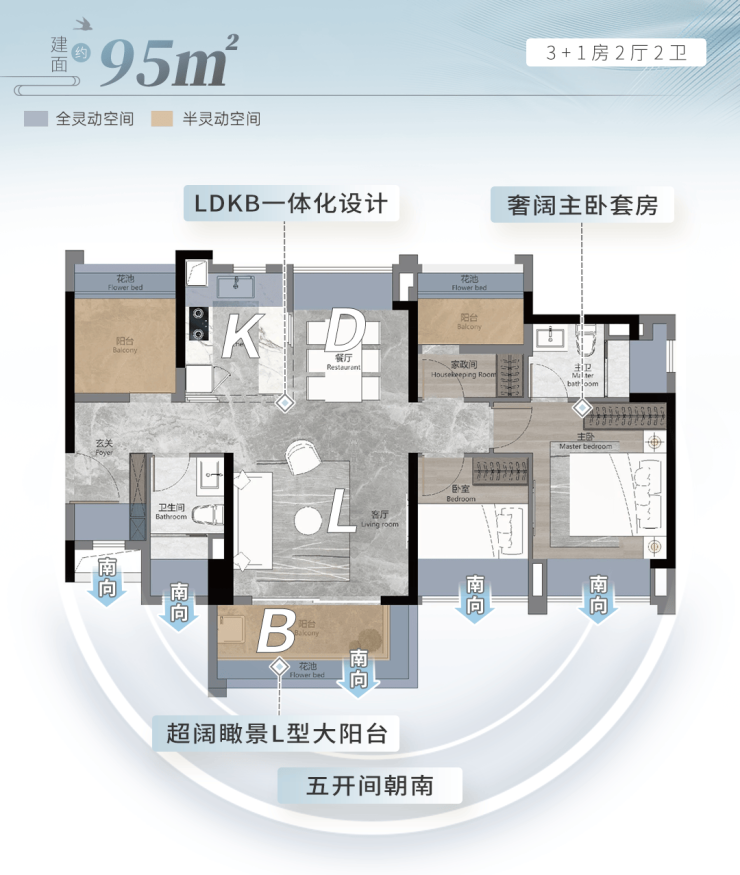 建面约95㎡3+1房,LDKB一体化设计,阔绰舒展的五开间朝南,约26㎡酒店总统式主卧套房,还能灵动布置X空间。