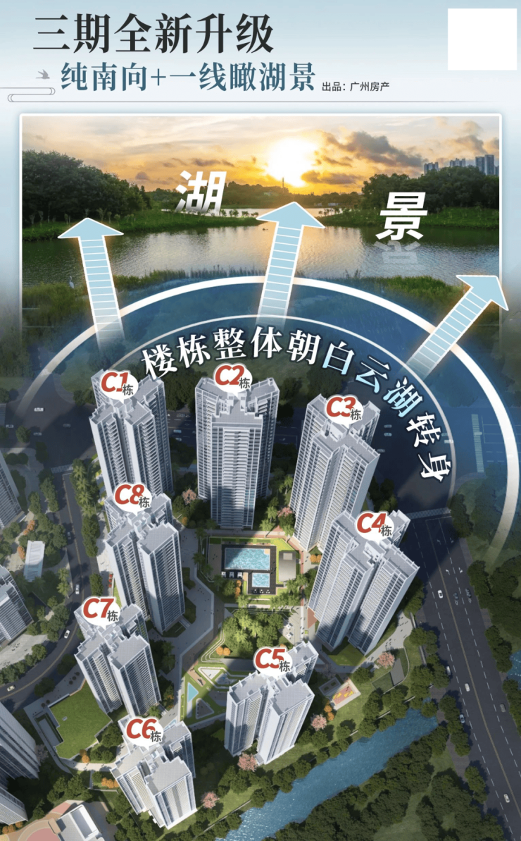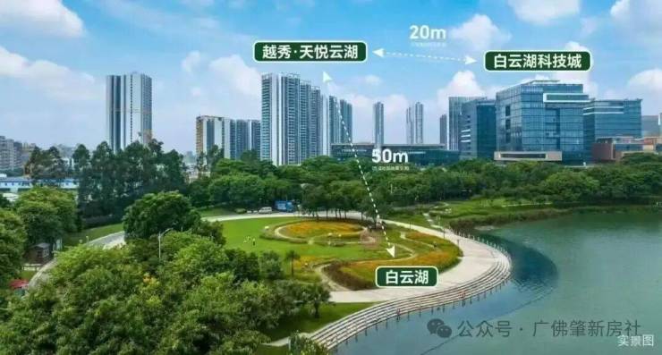 项目距离白云湖直线距离仅50米,约3000亩水体面积,是广州城央最大的人工湖,近10公里的绿茵跑道,业主都可以无缝享受,在家里就可以眺望白云湖的湖光风景。