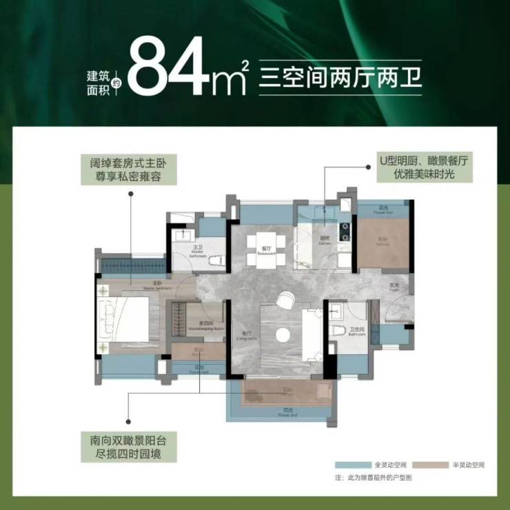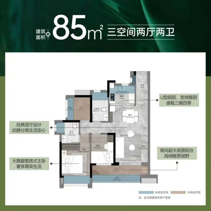 建面约85㎡2+1房,景观阳台尺度可与100㎡户型媲美,主卧配合X空间灵活调整,打通次卧作衣帽间/化妆间等,不成问题。建面约85㎡2+1房,景观阳台尺度可与100㎡户型媲美,主卧配合X空间灵活调整,打通次卧作衣帽间/化妆间等,不成问题。