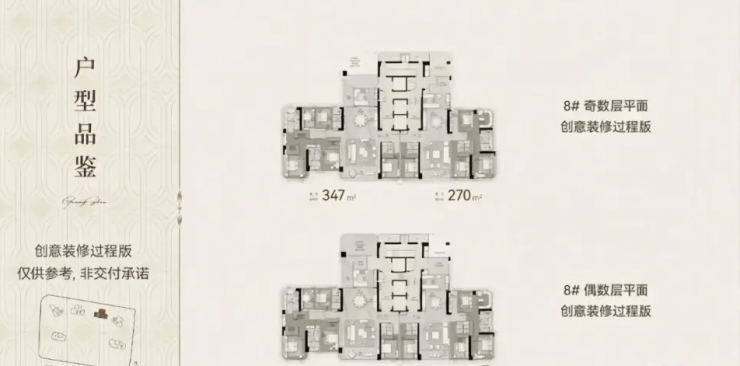 6号楼和8号楼均为49层高,在售270-273㎡、346-347㎡户型,3T2户独立梯厅,5.711.65m或7.911.7m直厅,南北对流双阳台,奇数层270-273㎡户型带有32㎡6.6m通高平台空间。