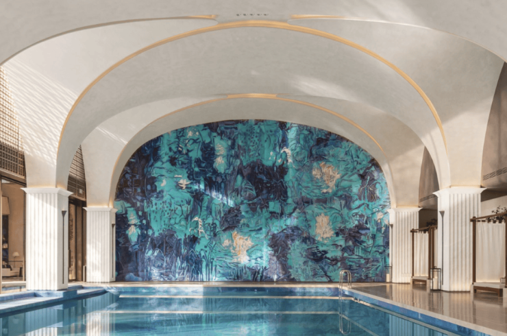 二进院“水境回廊”,将令人惊叹的“文化浓度”融于空间。六扇瑞兽纹墙以岭南剪纸工艺呈现,象征“六合天地”;两吨重约7.5米高鎏金铜门,由非遗大师朱炳仁锻造。