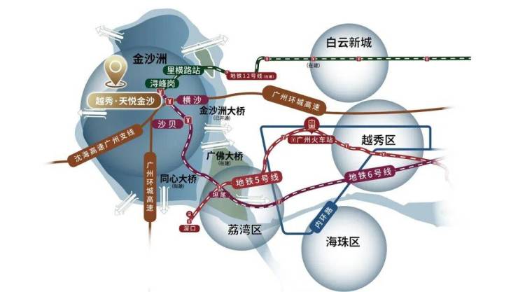 ✅地铁6号线浔峰岗站已开通,12号线在建中,预计2025年开通;通过金沙洲大桥上内环直达越秀区,三站地铁即达荔湾区,15分钟通达市中心,成熟宜居新城