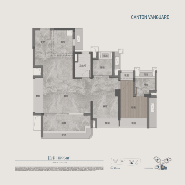 建面95㎡的4空间2厅2卫,四开间朝南,双面宽大阳台,约5.6m灵动宽厅和270°全景视野。