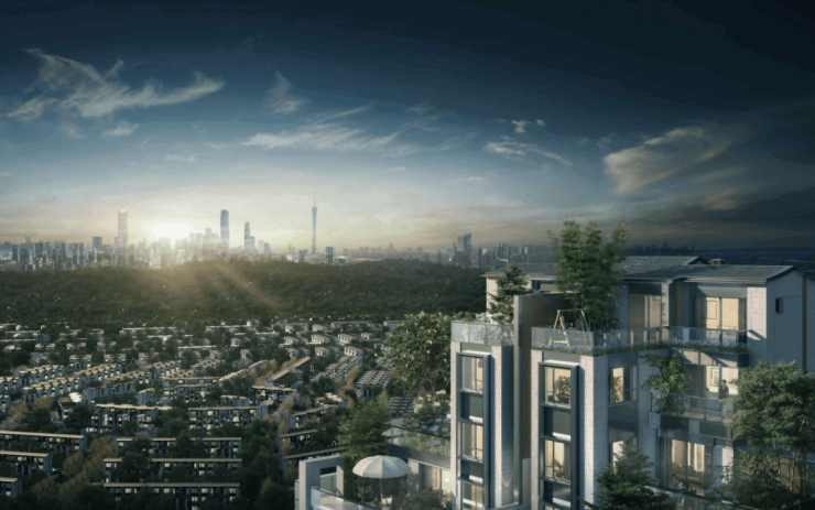 项目遵循坡地而上的地势, 前方环绕着约3.6万㎡山体景观 ,后方是一排排设计简约的像极了艺术品的别墅,户户享IMAX环幕瞰景体验,没有尴尬的对望,纯净的天空、漫山遍野的绿色尽收眼底。