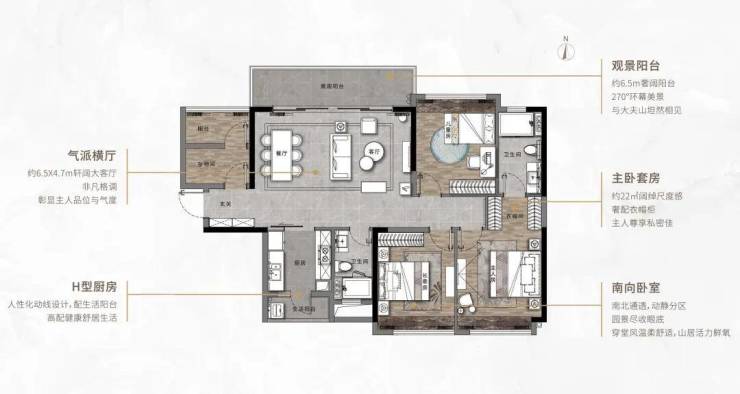 双阳台南北对流,6.5m超宽景观阳台,望大夫山、园林中轴双重景致;