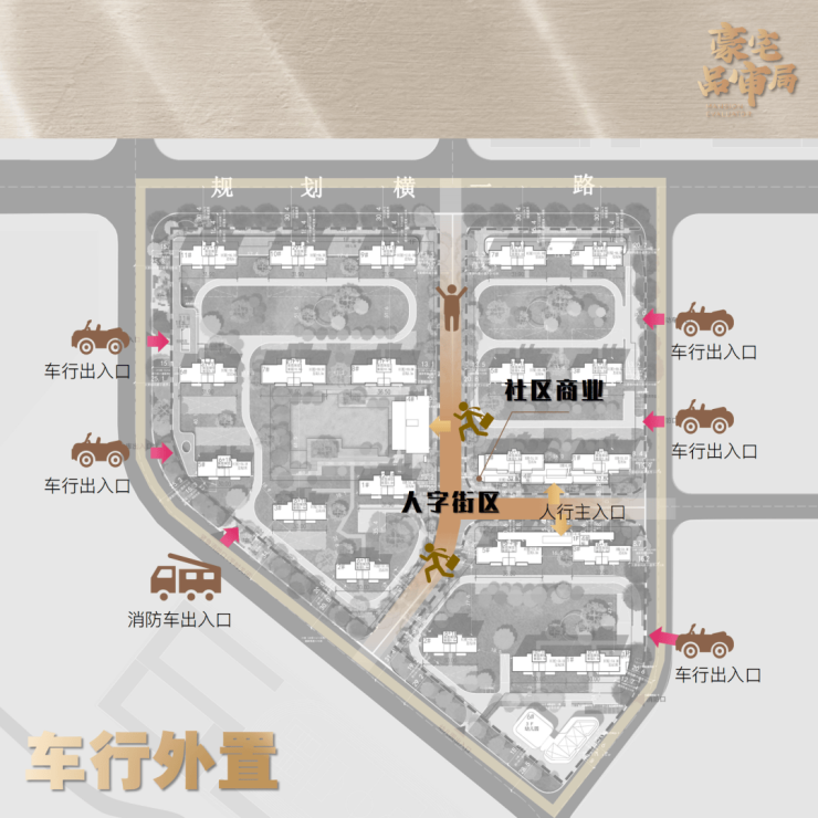总图动线设计上,将大部分车行出入口,快递、外卖、搬家等外部车流线,都设置在外围一圈市政道路之上,降低对居民生活影响,也保证了社区内部的私密性。
