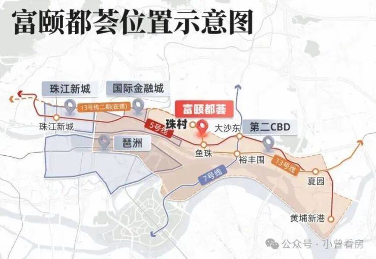 交通方面,项目距离地铁 5 号线鱼珠站约 2.4 公里,13 号线二期珠村站约 2.7 公里,步行出行需借助交通工具接驳。