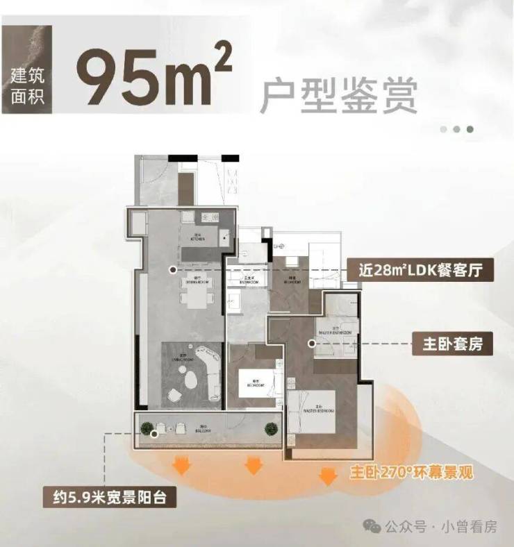 R5、R6 栋加推的 118㎡四房采用 LDKB 一体化设计,带有超 8㎡多功能空间,125㎡四房为南北对流,主卧带 270° 环幕飘窗。