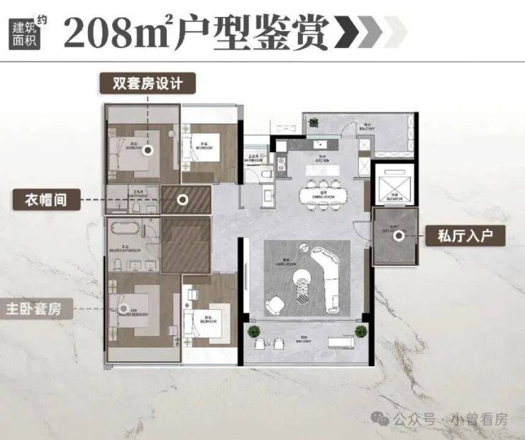 此外,R 区 R11 栋还有 151㎡、176㎡和 208㎡的四居室在售,151㎡为独梯独户,带 7.5 米长阳台,176㎡南北双阳台通透,208㎡有近 85㎡社交空间。