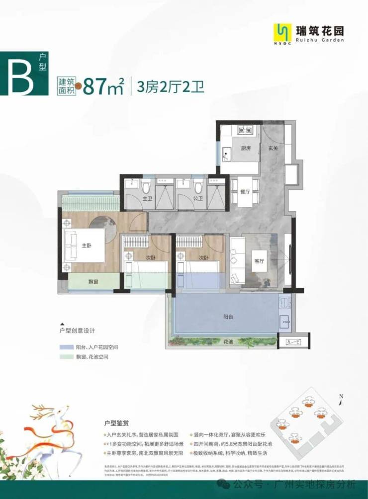 87㎡3房2卫,四开间朝南,一体化双厅设计,约6米阔绰尺度,南向四开间,约5.8米宽幕阳台。
