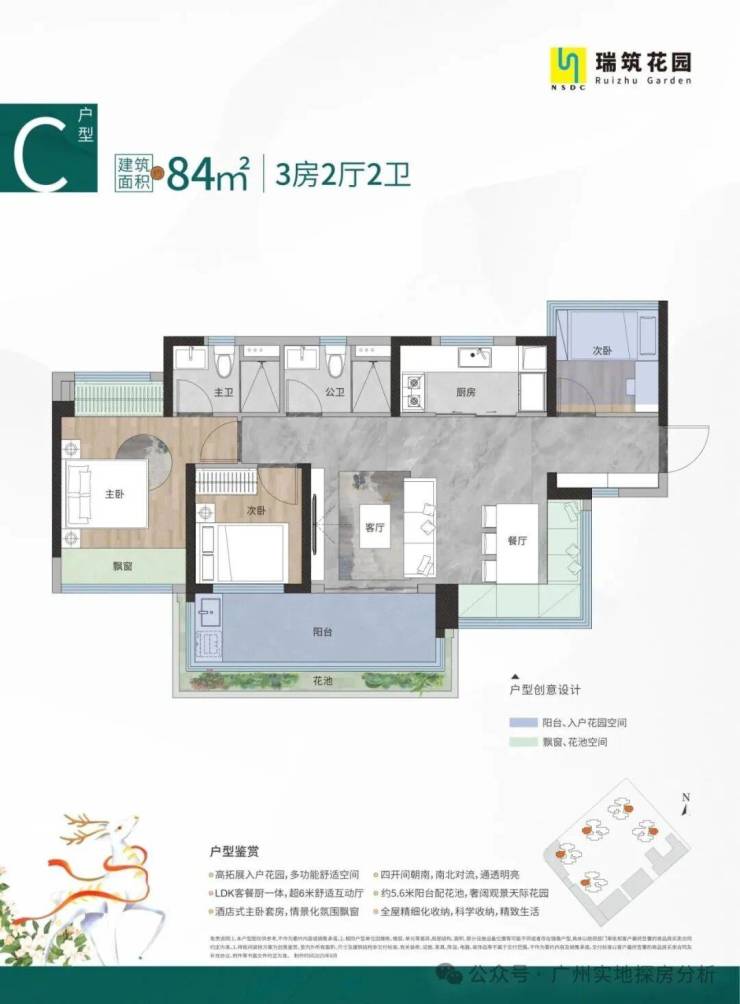 84㎡3房2厅2卫,超11米通透采光面,独立单边位,四开间朝南,南北对流,超6米舒适互动厅