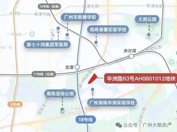 项目坐落于广州中心城区海珠区之心,华洲路旁,西侧为广州海珠湿地公园,南侧邻石榴岗河,距离地铁11号线(在建)和18号线换乘的石榴岗站约1200米,距离琶洲南TOD不到两公里。