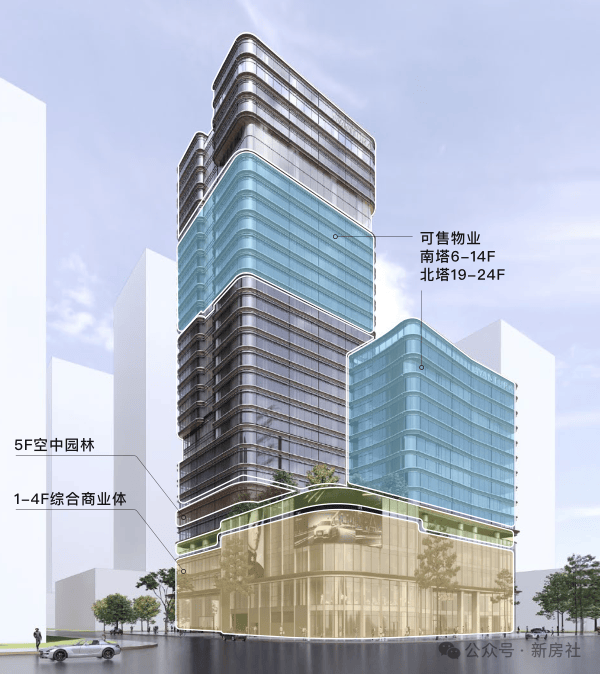 小区配套:位于金融城东区,一线望江。项目占地约7600㎡,总建筑面积约8万㎡,楼高约131.9米,分为南北两座塔楼。