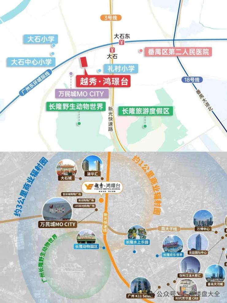 1、交通:项目步行700米就到3号线大石站,1站到汉溪长隆、2站到南村万博、6站珠江新城,未来还有26号线(已环评)群贤路站在家门口。