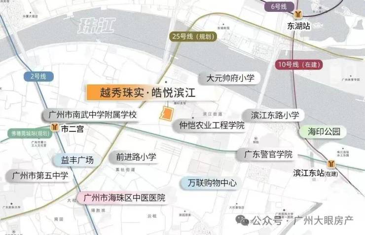 项目其实不是很近地铁站,最近2号线市二宫站步行距离大约1.2公里,有点不上不下的距离,最好是电动车需要接驳,一站江南西/海珠广场,2站昌岗/公元前,东侧还有10号线滨江东站也已经开通了