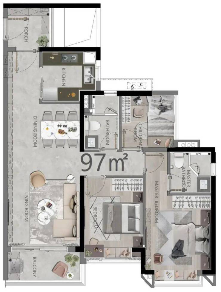 最受刚需家庭关注的是 97㎡的三房两厅两卫,总价约 360-380 万元,单价 3.8 万 / 平起。这个户型带专属入户花园,三开间都朝南,还有一个N+1可变空间,主卧搭配超阔观景飘窗,采光和实用性都不错,很适合*置业的小家庭。