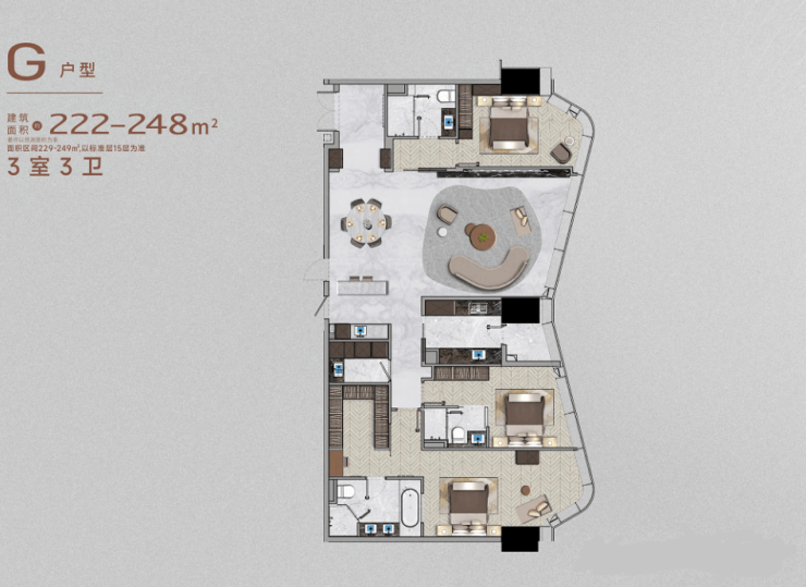 最后来看看产品部分,项目主推建面约150-350㎡大平层,高达约4.1米的奢华层高,全盘仅120席,极度稀缺。