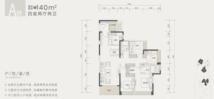 建面约140㎡户型:是整个项目货量最多,最主打的户型,分为横厅和竖厅设计。