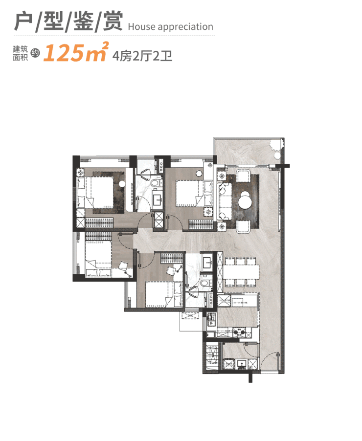 建面约125㎡四房:格局相对方正,均为北向设计。