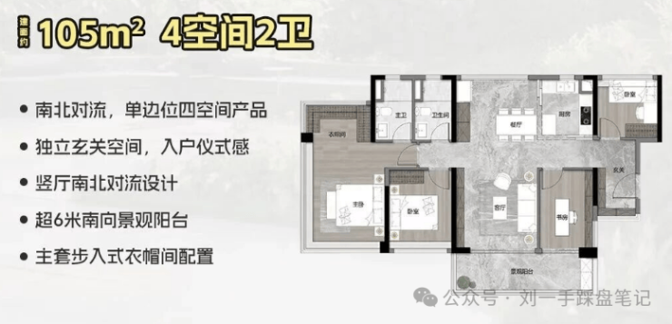 105㎡四房两卫,带入户花园,餐厅有飘窗,可与客厅、阳台形成南北对流
