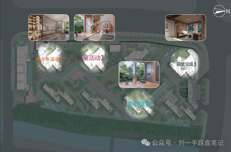 公共空间,包括中央绿岛、儿童FUN享乐园、草坪剧场、有氧跑径、主题架空层等,绿意盎然,老少各得其乐