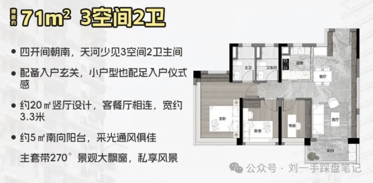 71㎡就做到三房两卫,四开间全南向,玄关位置可打造收纳柜,主卧是套房设计,带L型超大飘窗