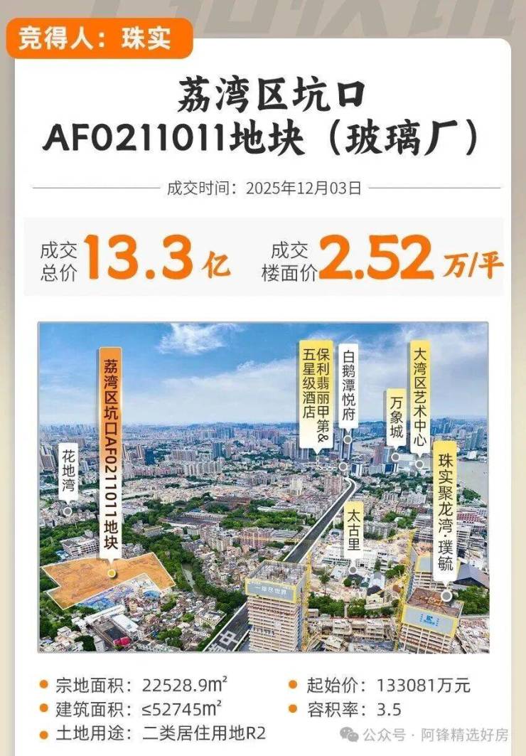 珠实以13.3亿总价竞得荔湾玻璃厂地块(即坑口AF0211011地块),折合楼面价2.52万/㎡,就在太古里对面!