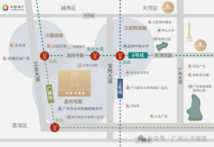 买房③要素,地段、地段、还是地段,项目位于海珠昌岗中路与宝岗大道交汇处,宝岗大道、工业大道、江南大道,海珠三大黄金走廊环绕。