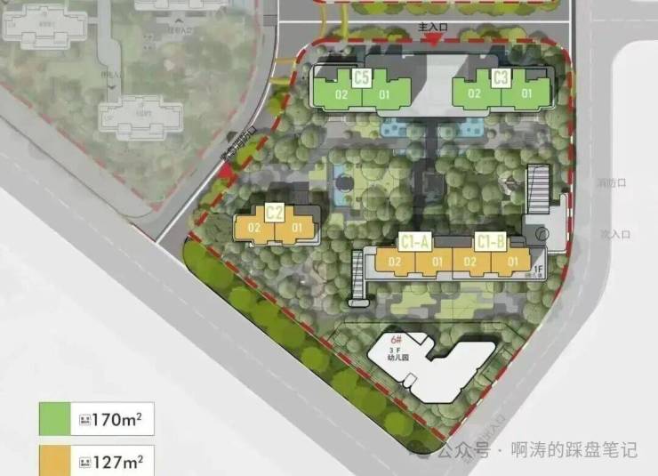整个小区所有楼栋都是正南正北T2板楼,一共三个地块,你也可以看作是一个整体,因为保利把分割三个地块的道路变成密林景观道。可以通过茂密的树丛遮挡道路和行车,在楼上往下看就是一个连成一体的大花园。
