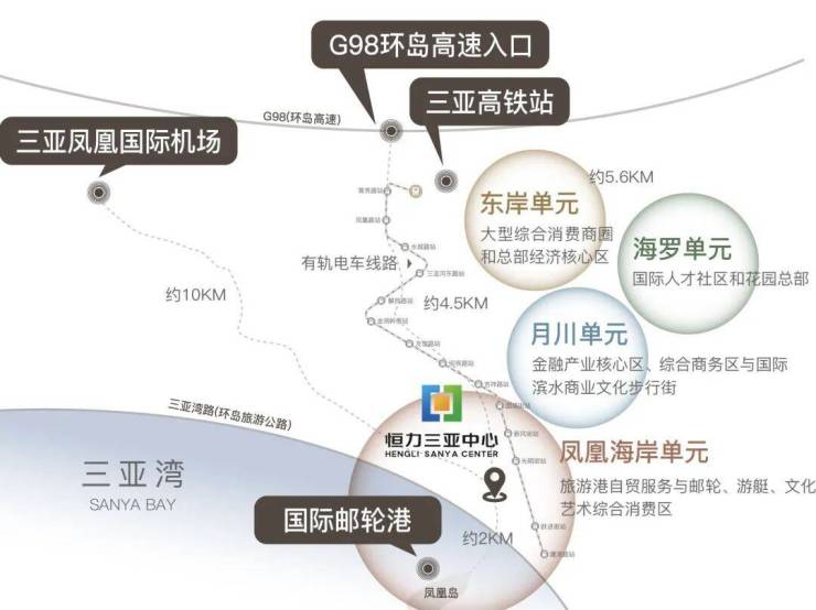 01【全维配套丨交通】单元:项目位于三亚CBD凤凰海岸单元,是三亚中央商务区唯一一线海景地块,定位为国际滨海总部湾区(含总部经济、旅游消费、文化艺术)。海港:距离三亚凤凰岛国际邮轮港约2公里,380多个航次的国际邮轮经停,航线覆盖30+国家和地区。路网:未来海底隧道和高速磁悬浮列车畅达全岛(于三亚高铁站搭乘);距三亚高铁站约4.5公里,或选择家门口的有轨电车直达高铁站;距G98环岛高速约5.6公里,近邻环岛旅游公路及环热带雨林旅游公路。空港:距离凤凰国际机场约12公里,109条航线通达全球。