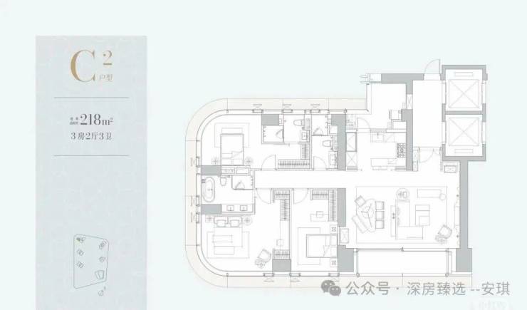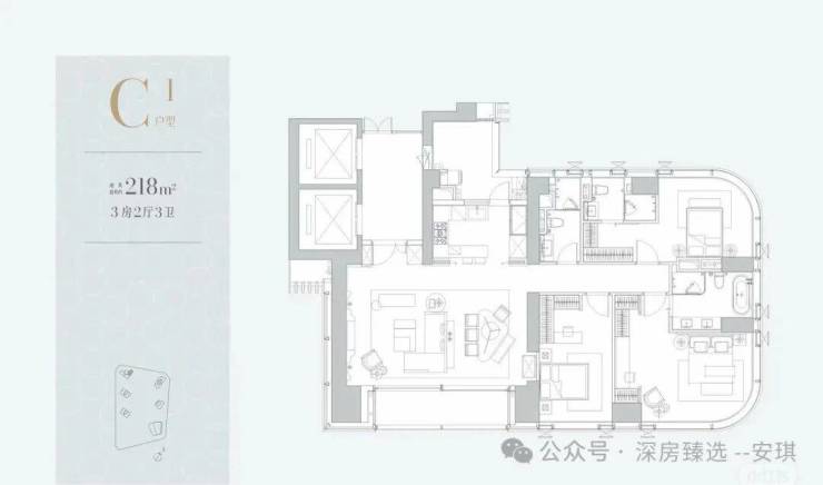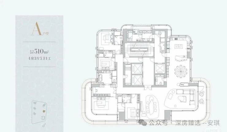 共36套,位于A栋(43F),层高3.6米,3T1,目前深圳还没有这个面积段的二手大平层住宅,直接对标澐玺的500㎡。