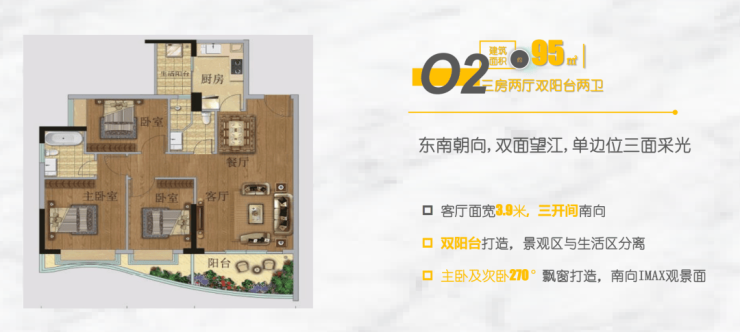 🅣🅞🅟02户型【95㎡3房2卫】东南向望江